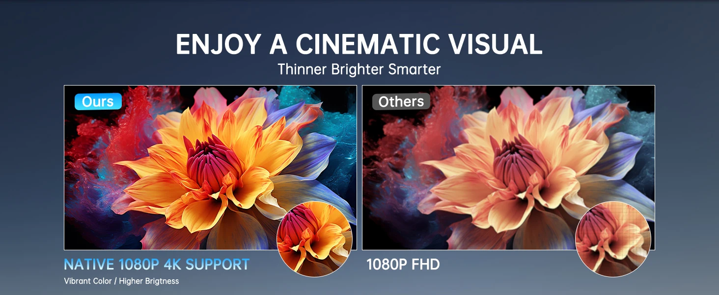 【Sleek and Portable Design】Its compact, lightweight form factor allows you to slip it into your bag with ease, ready for any projection, movie night, or trip.